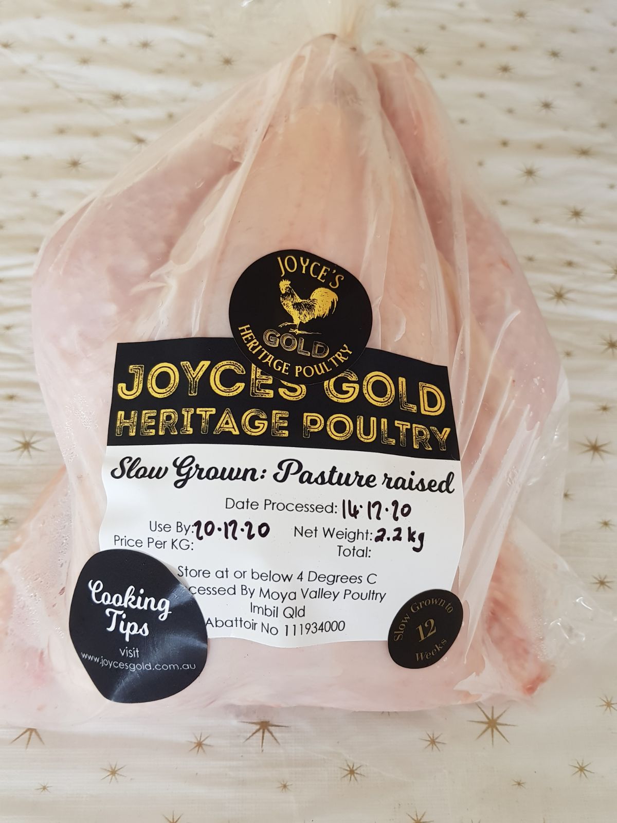 Joyces Gold Premium slow grown whole chicken $16 per kg (Av weight 2.45kg)